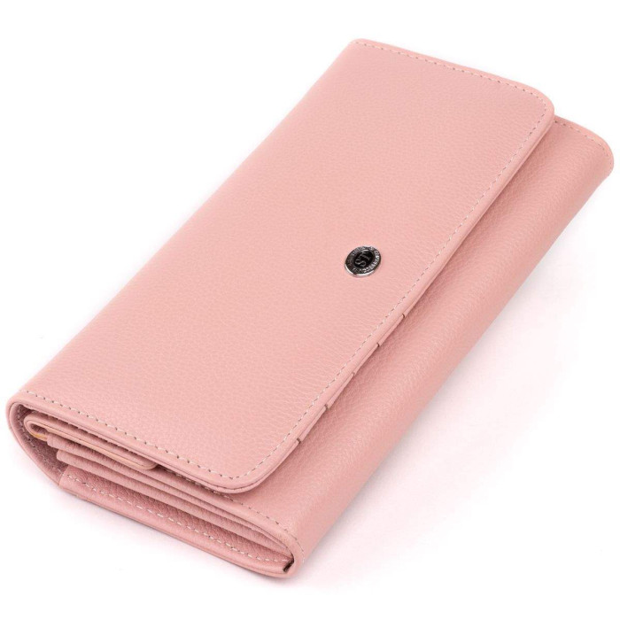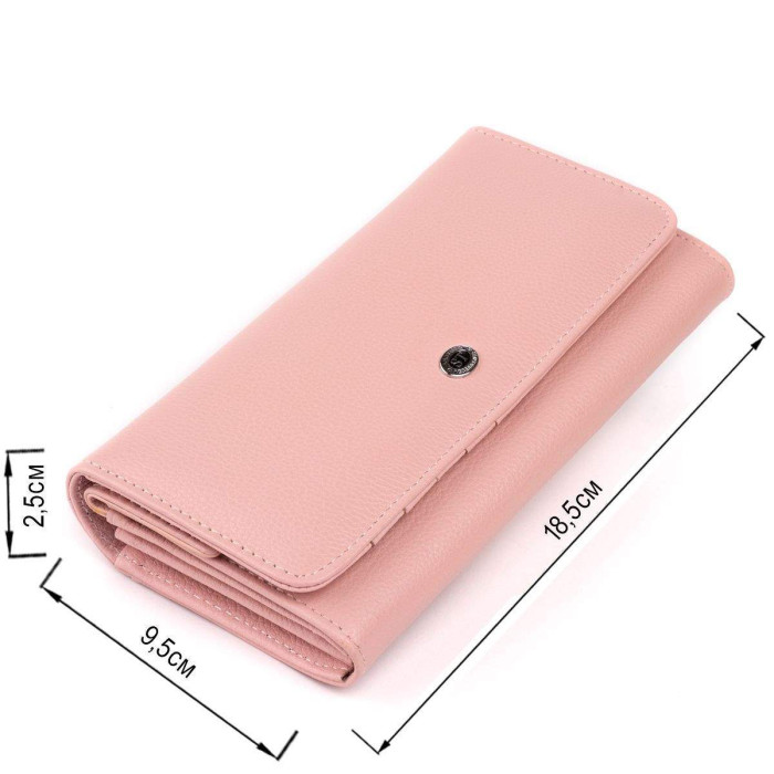 Елегантний жіночий гаманець з натуральної шкіри ніжного пудрового кольору. Шкіра, з якої виконаний гаманець дуже м'яка і еластична. По краях гаманець прошитий світлим рядком. Гаманець складається з двох автономних частин: для купюр і карток і відкритого відділення для особистих речей під кнопкою. На тильній стороні кишеню відкритого типу. На лицьовій стороні металевий логотип бренду. У комплекті до гаманця йде фірмова картонна коробка. Виріб стане прекрасним подарунком для близької людини.