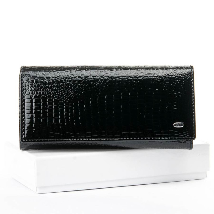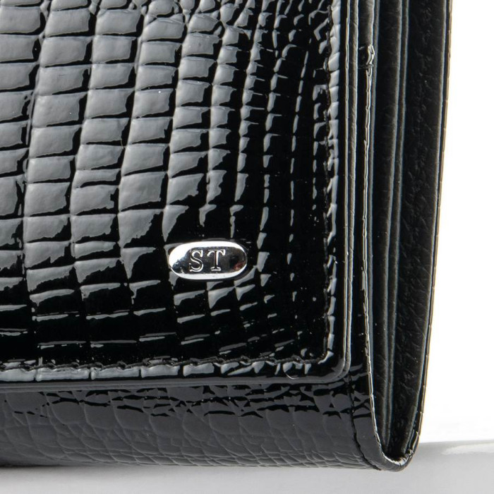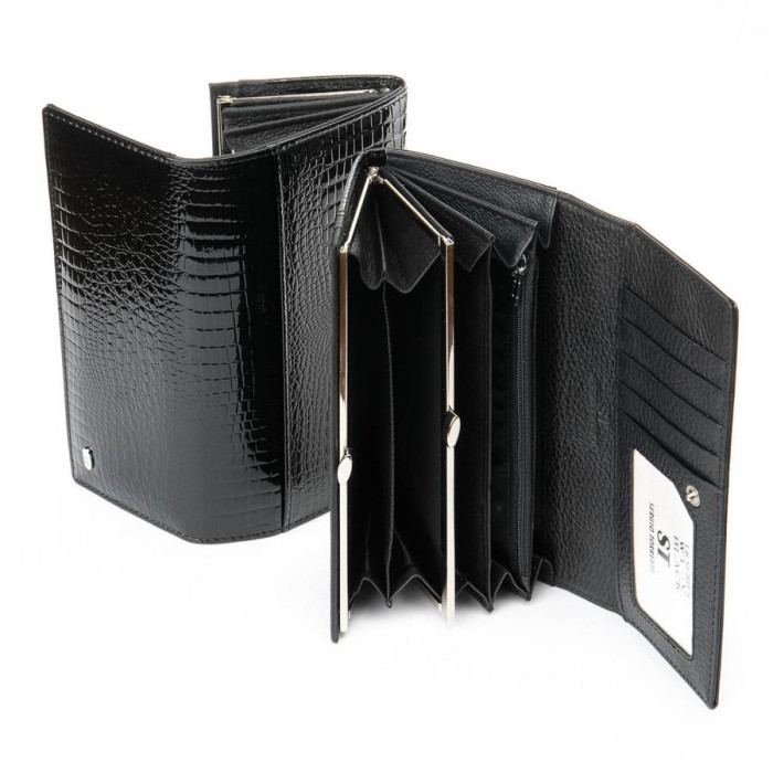 Великий жіночий шкіряний гаманець Sergio Torretti. Зовнішня частина - лакова шкіра, внутрішня частина - натуральна м'яка шкіра. Основне відділення закривається на кнопку. Всередині є 3 відкриті відділення для банкнот, подвійна монетниця на защіпку, кишеня-перегородка на блискавці, одна велика відкрита кишеня і 9 кишень для візитних карток, одна із яких прозора. Зовні гаманця на звороті є плоска відкрита кишеня.
