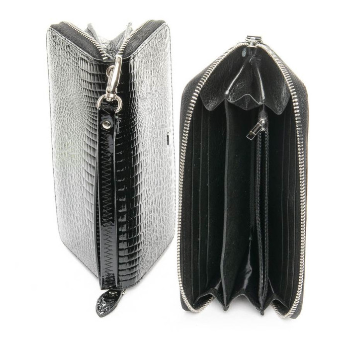 Великий жіночий гаманець-клатч Sergio Torretti. Зовнішня частина - лакова шкіра, внутрішня частина - натуральна м'яка шкіра. Закривається на блискавку. Всередині 3 відділення для банкнот, відділення для дрібниць на блискавці, дві великих відкритих кишені, 8 кишень для карт і візиток. В комплекті кистьовий ремінець.