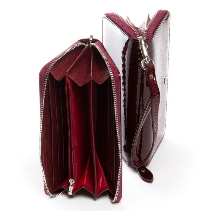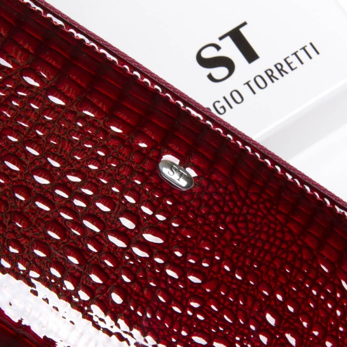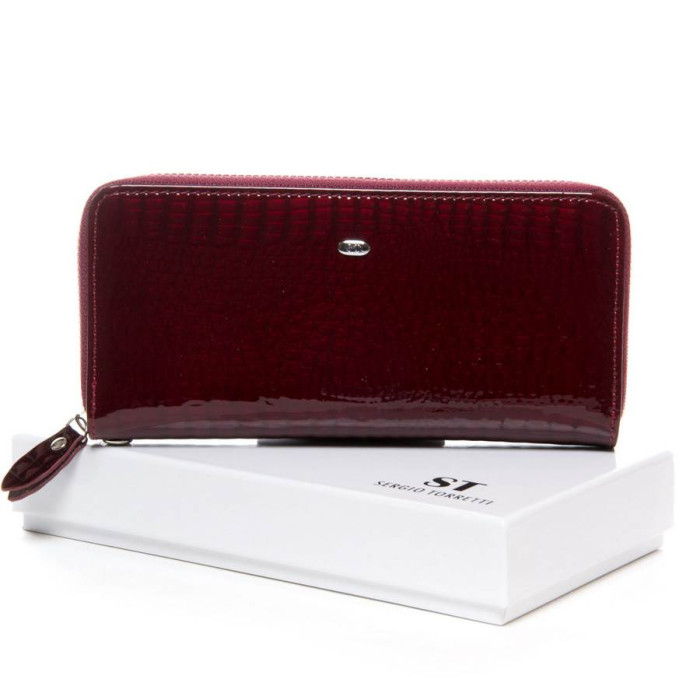 Великий жіночий гаманець-клатч Sergio Torretti. Зовнішня частина-лакова шкіра, внутрішня частина-натуральна м'яка шкіра. Закривається на блискавку. Всередині 3 відділення для банкнот, відділення для дрібниці на блискавці, дві великі відкриті кишені, 8 кишень для карт і візиток. В комплекті кистьовий ремінець.