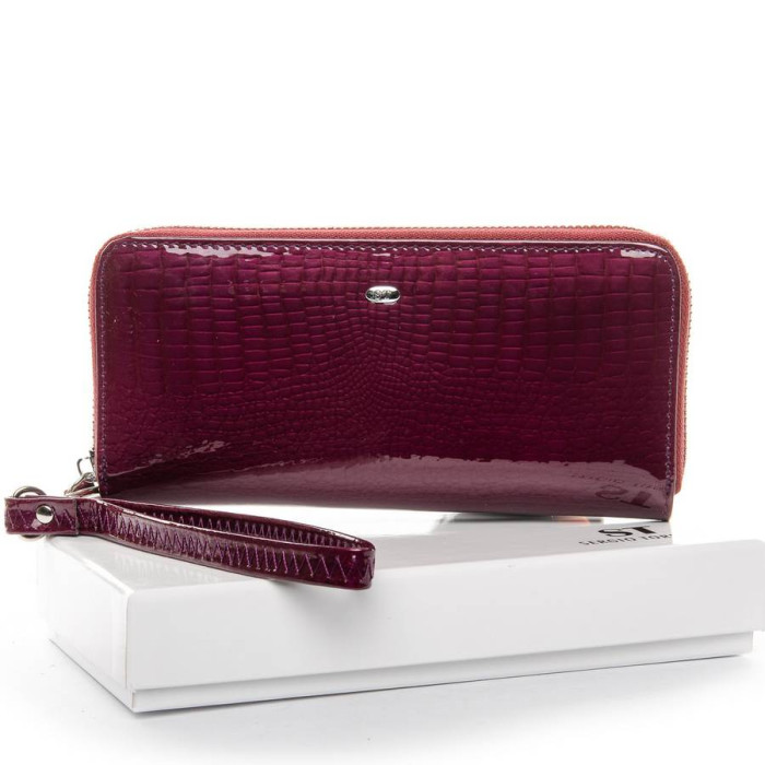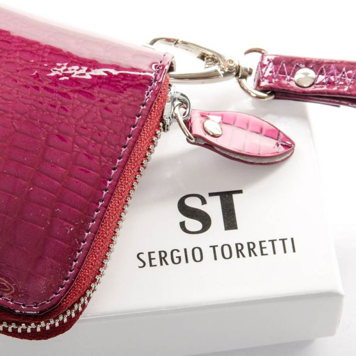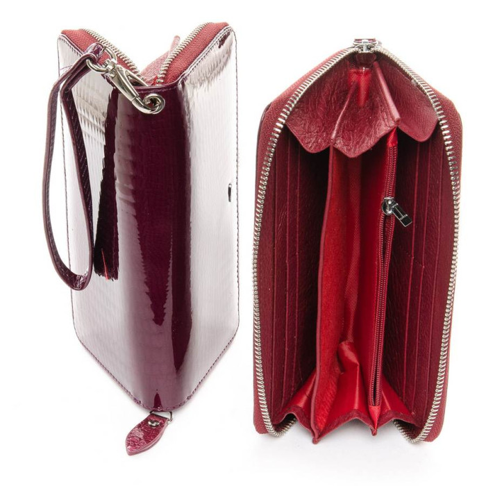 Великий жіночий гаманець-клатч Sergio Torretti. Зовнішня частина-лакова шкіра, внутрішня частина-натуральна м'яка шкіра. Закривається на блискавку. Всередині 3 відділення для банкнот, відділення для дрібниці на блискавці, два великих відкритих кишені, 8 кишень для карт і візиток. В комплекті кистьовий ремінець.