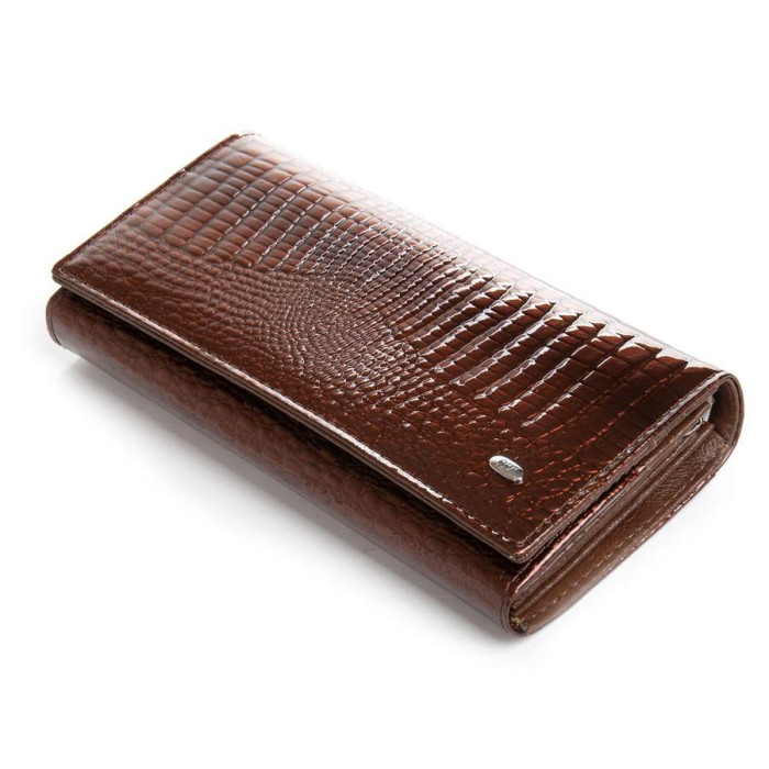 Зовнішня частина - рельєфна лакова шкіра серії Croco, внутрішня частина - натуральна м'яка шкіра. Всередині знаходяться 3 відкритих відділення для банкнот, велика кишеня на блискавці, подвійна кишеня-монетниця на засувці, одна велика відкрита кишеня і 8 кишень для візитних карток. Зовні гаманця на зворотному боці є відкрита плоска кишеня.