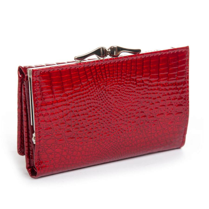 Зовнішня частина - рельєфна лакова шкіра серії Croco, внутрішня частина - натуральна м'яка шкіра. Всередині знаходяться 2 відкритих відділення для банкнот і одне відділення на блискавці, 7 кишень для візитних карток (одна з них прозора). Зовні гаманця на торці є кишеня-монетниця на засувці.