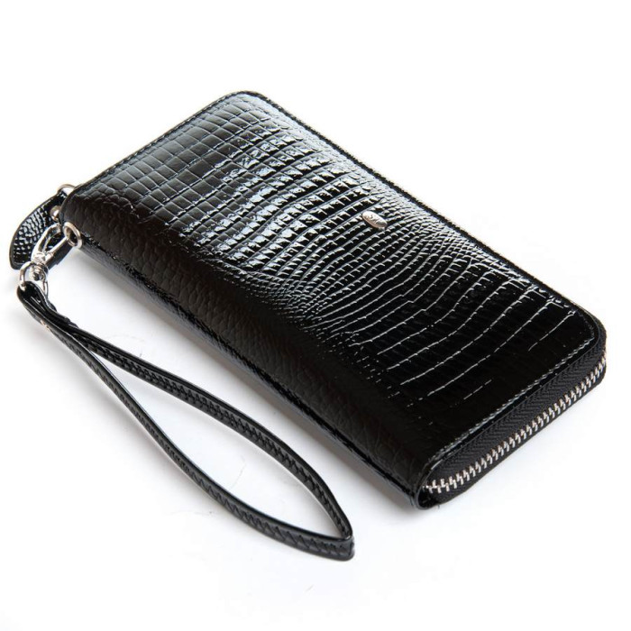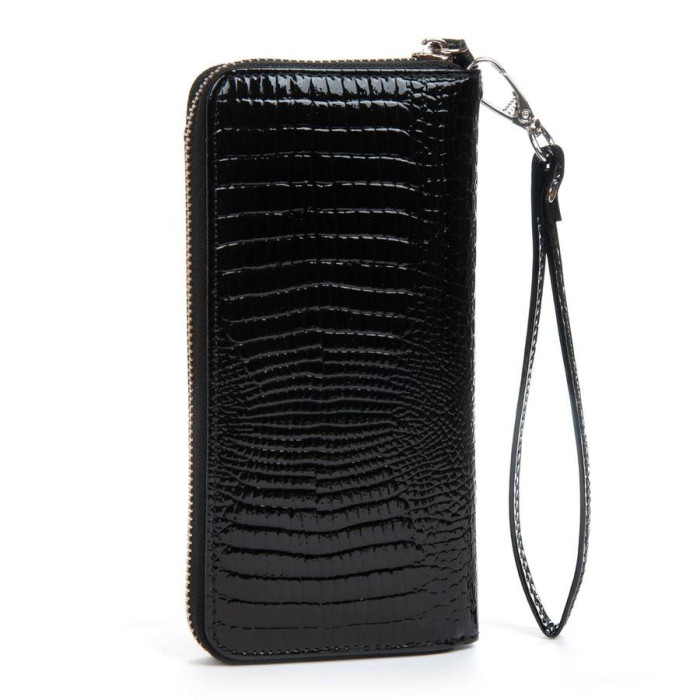 Зовнішня частина - рельєфна лакова шкіра серії Croco, внутрішня частина - натуральна м'яка шкіра. Всередині знаходяться 3 відкритих відділення для банкнот, кишеня-монетниця на блискавці, 2 великих відкритих кишені і 8 кишень для візитних карток. У комплекті шкіряний ремінець на кисть.
