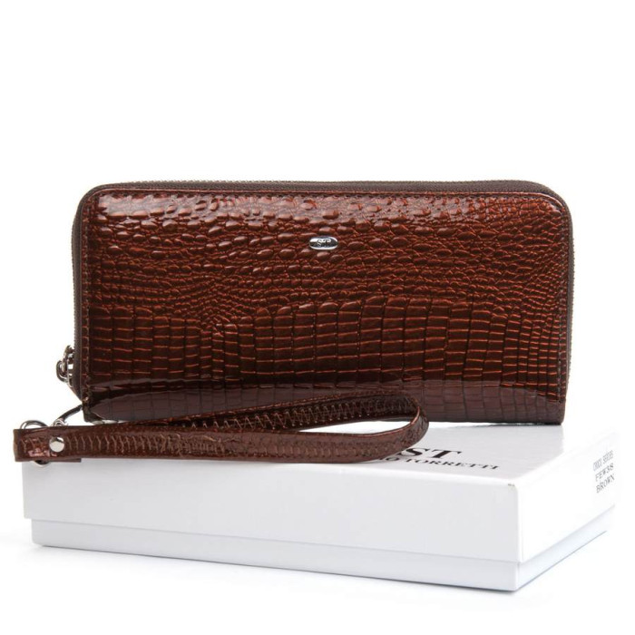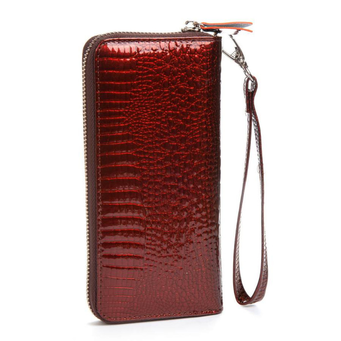 Зовнішня частина - рельєфна лакова шкіра серії Croco, внутрішня частина - натуральна м'яка шкіра. Всередині знаходяться 3 відкритих відділення для банкнот, кишеня-монетниця на блискавці, 2 великих відкритих кишені і 8 кишень для візитних карток. У комплекті шкіряний ремінець на кисть.