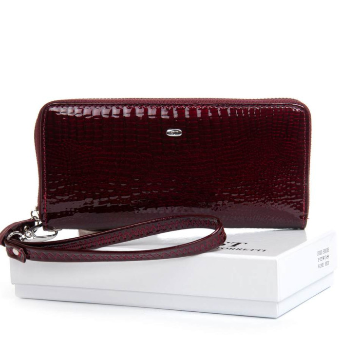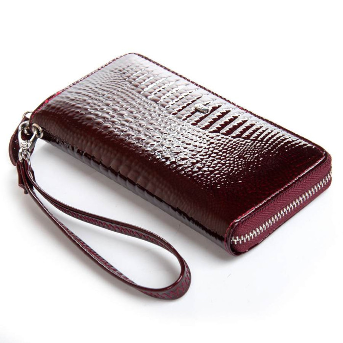 Зовнішня частина - рельєфна лакова шкіра серії Croco, внутрішня частина - натуральна м'яка шкіра. Всередині знаходяться 3 відкритих відділення для банкнот, кишеня-монетниця на блискавці, 2 великих відкритих кишені і 8 кишень для візитних карток. У комплекті шкіряний ремінець на кисть.