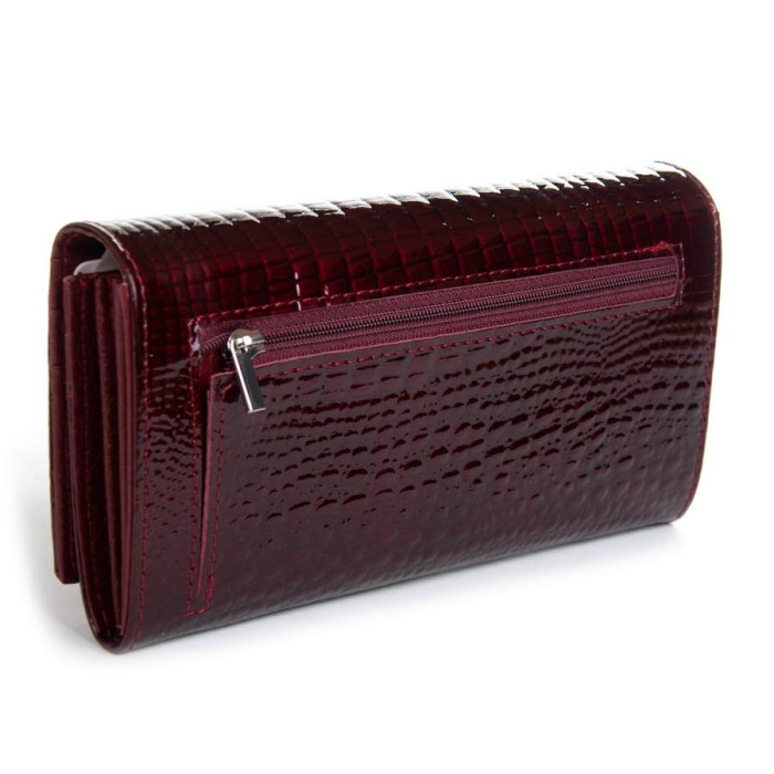 Зовнішня частина - рельєфна лакова шкіра серії Croco, внутрішня частина - натуральна м'яка шкіра. Всередині знаходяться 4 відкритих відділення для банкнот, дві кишені-монетниці на блискавці, одна велика відкрита кишеня, 8 кишень для візитних карток. Зовні гаманця на зворотному боці є кишеня на блискавці.