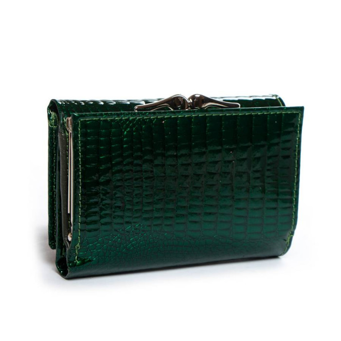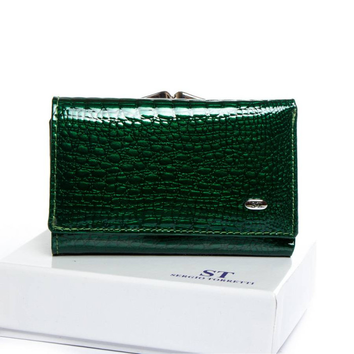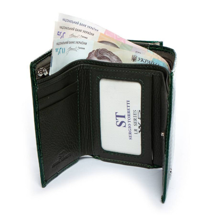 Компактний жіночий гаманець Sergio Torretti. Зовнішня частина – лакова шкіра, внутрішня частина – натуральна м'яка шкіра. Основне відділення закривається на кнопку і складається втричі. Усередині знаходяться 2 відкритих відділення для банкнот і одне на блискавці, 5 кишень для візитних карток, одна з яких є прозорою. Зовні гаманця на звороті є монетниця на клямці.