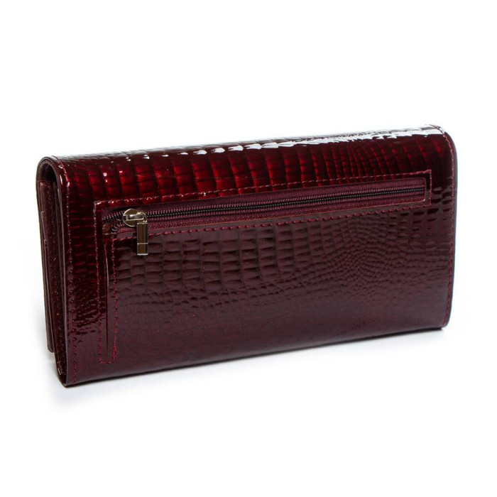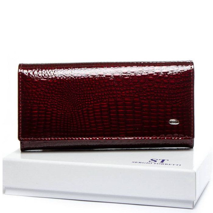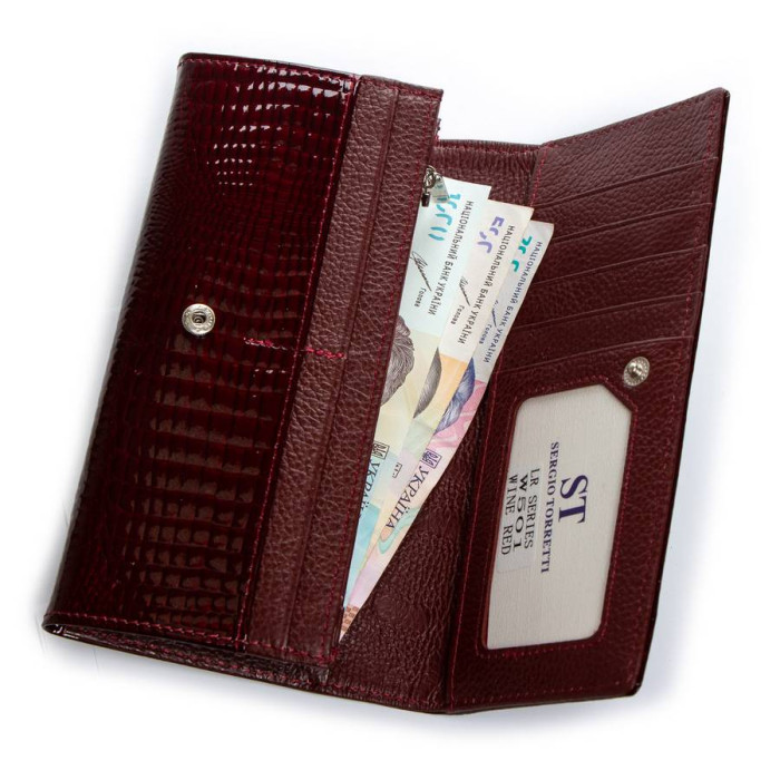 Великий полегшений жіночий шкіряний гаманець Sergio Torretti. Зовнішня частина - лакова шкіра, внутрішня частина - натуральна м'яка шкіра. Основне відділення закривається на кнопку. Усередині знаходяться 4 відкриті відділення для банкнот, два кармана-монетниці на блискавці, одна велика відкрита кишеня, 9 кишень для візитних карт, один з яких прозорий. Зовні гаманця на зворотному боці є кишеня на блискавці. Розмір (см) 18,5*9,5*3,5