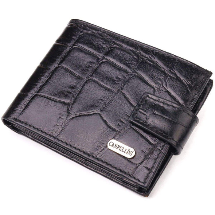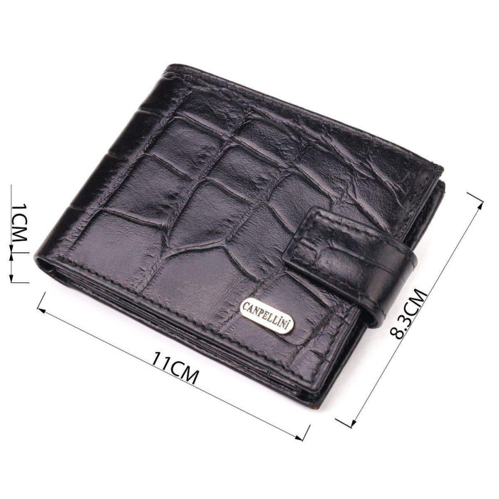 Практичний чоловічий портмоне, з натуральної фактурної шкіри, з тисненням під крокодила, у насиченому чорному кольорі. Аксесуар має одне основне відділення з перегородкою, в якому розміщуються купюри всіх номіналів, дванадцять кишень для карток, чотири з яких під сіточкою. Закривається аксесуар хлястиком на кнопку. Колір фурнітури – срібло. Ви легко зможете помістити його в кишеню штанів чи маленьку сумку. Запакований гаманець картонну коробку. Шкіряний гаманець є чудовим подарунком для рідних та близьких людей.