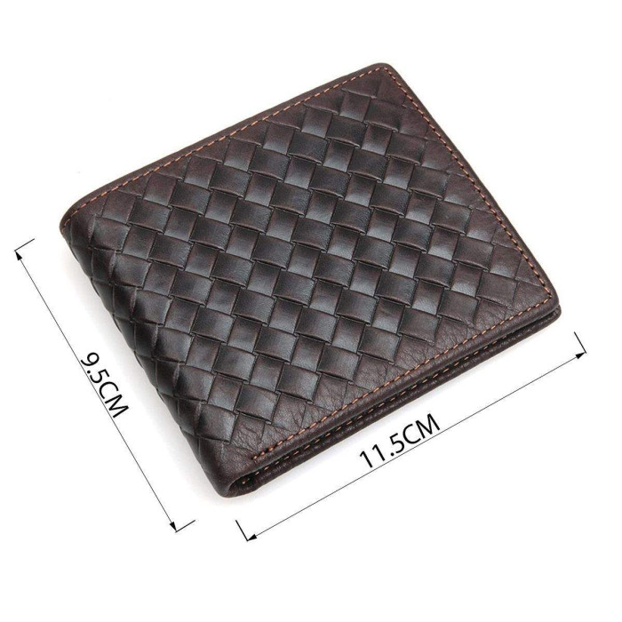 Зручне чоловіче портмоне з натуральної шкіри. Дана модель легко поміщається в передній або задній кишені джинсів. Гаманець акуратно прошитий світло-коричневою ниткою. Зовнішня сторона даної моделі має декоративний, тиснення малюнок. Гаманець упакований в текстильний пилозахисний чохол білого кольору.