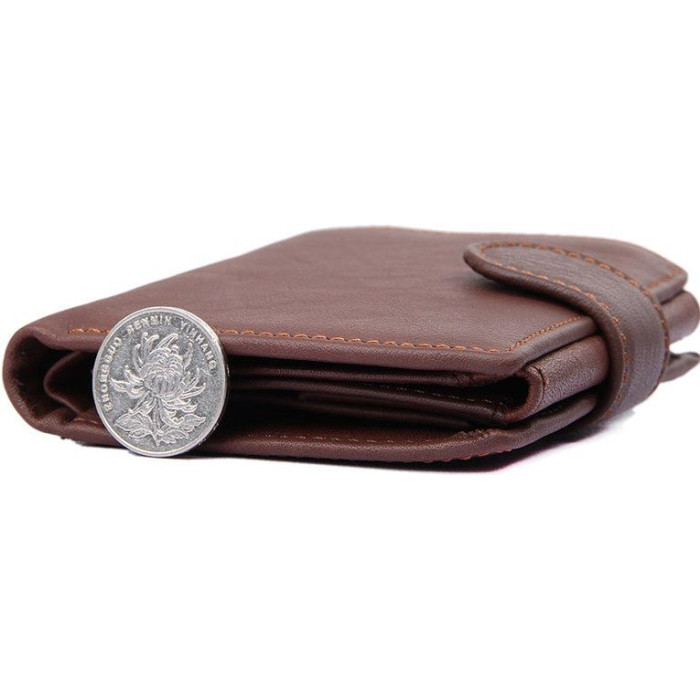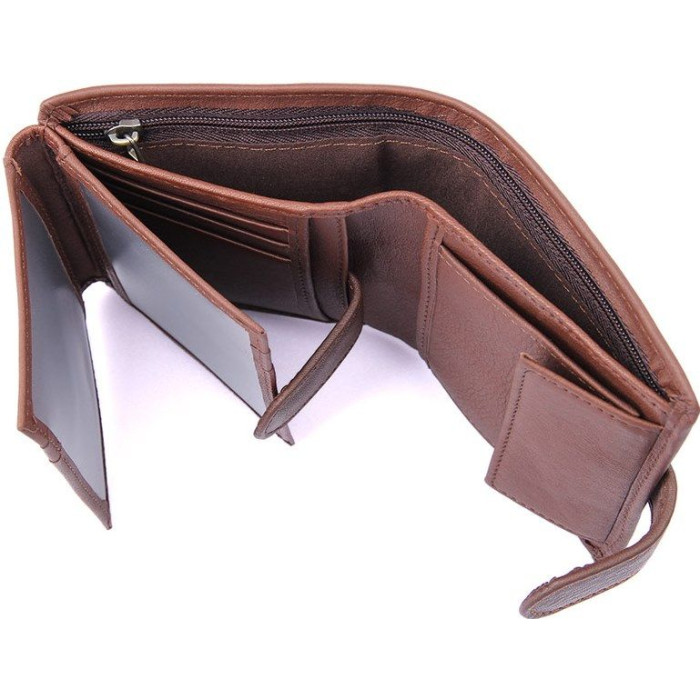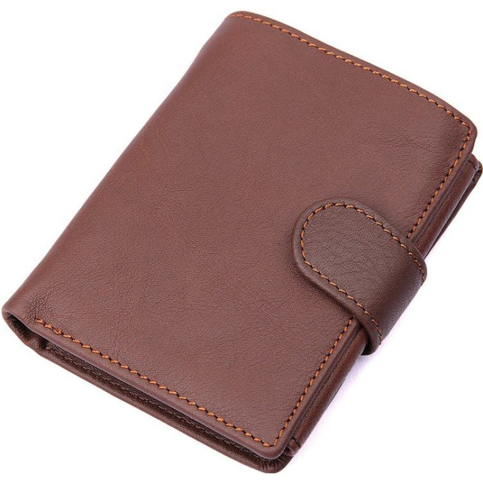 Оригінальний чоловічий гаманець коричневого кольору. Аксесуар виконаний з натуральної високоякісної фактурної шкіри приємної на дотик. Гаманець акуратно прошитий світло-коричневою ниткою, що надає йому солідності. Колір фурнітури: латунь. Виріб упаковано в текстильний пилозахисний мішечок білого кольору.