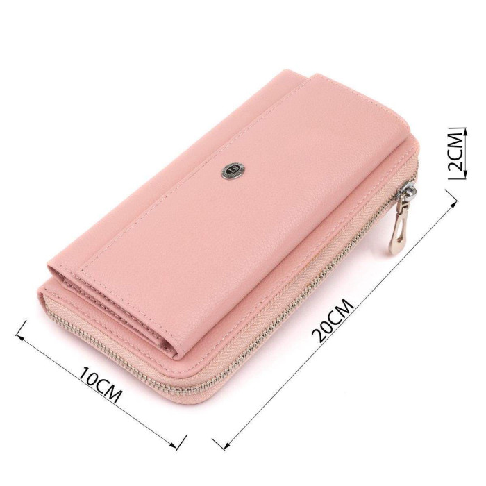 Гаманець стане найзручнішим у вашому житті. Виріб складається з двох автономних частин (на блискавці і під магнітом). У нього ви можете помістити досить купюр в розгорнутому вигляді і багато карток. З таким гаманцем всі ваші речі точно будуть в порядку і на своїх місцях. Ви також можете носити його самостійно без сумочки за шкіряний ремінець-петельку на зап'ясті. Усередині гаманець з щільного текстилю та натуральної шкіри. Виріб ніжного рожевого кольору прекрасно підкреслить вашу витонченість. Модель упакована у фірмову картонну коробку і стане найкращим подарунком для будь-якої дівчини.