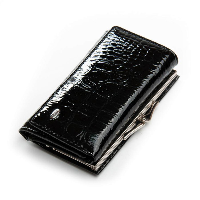 Виготовлений з лакової шкіри. Складається втричі і закривається на кнопку.