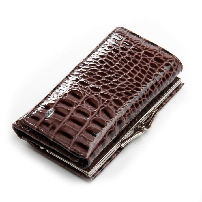 Виготовлений з лакової шкіри. Складається втричі і закривається на кнопку.