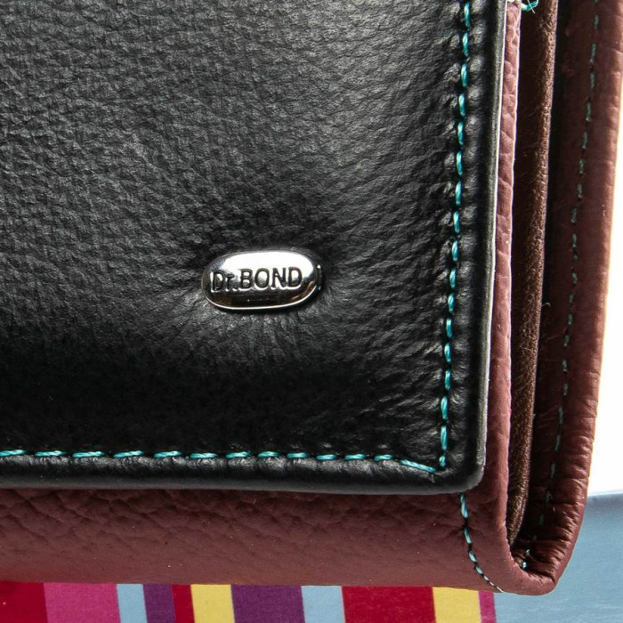 Великий полегшений жіночий гаманець Dr.Bond. Виготовлений із натуральної м'якої шкіри з природною текстурою. Закривається на прихований магніт. Усередині знаходяться 2 відділення для банкнот, подвійна кишеня-монетниця на блискавці, 2 великі відкриті кишені та одна кишеня на блискавці, і 10 кишень для карт та візиток. Зовні гаманця на звороті є кишеня на блискавці.