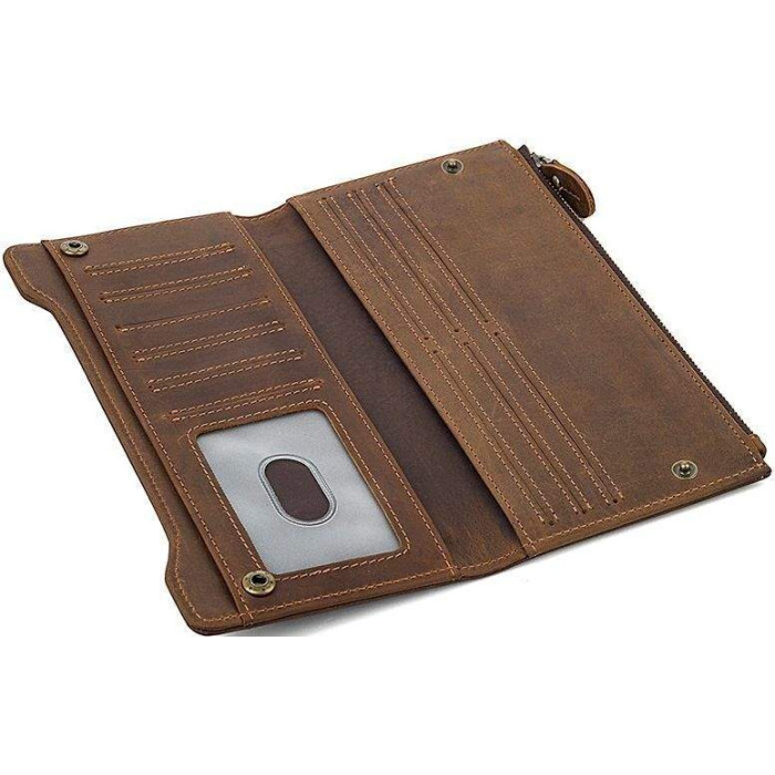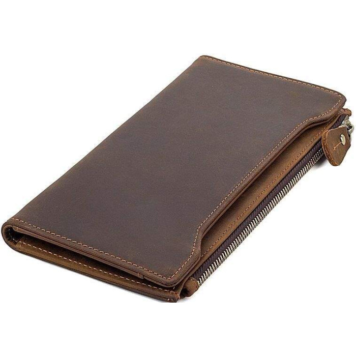 Стильний гаманець з високоякісної вінтажної шкіри, така шкіра відрізняється неоднорідною фактурою і потертостями, які надають їй унікальний і неповторний стиль. Гаманець надійно прошитий коричневою ниткою. Дуже красивий і якісний аксесуар, який підійде як жінці, так і чоловіку.
