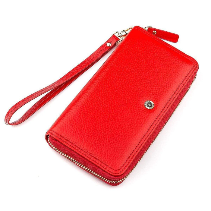 Елегантний жіночий гаманець оформлений в червоному кольорі, виготовляється з натуральної шкіри з привабливою фактурою, а також текстильною підкладкою всередині. У комплектації йде ремінець для руки, тому аксесуар можна легко використовувати в якості клатчу. Місткість виробу сподобається всім, адже представлені відділення, слоти і кишені просторі і дуже якісні, а закривається гаманець блискавкою зі зручною і приємною шкіряною ручкою. Чоловіків порадує красива упаковка, яка дозволить надати коханій половинці шикарний подарунок з великою функціональністю.