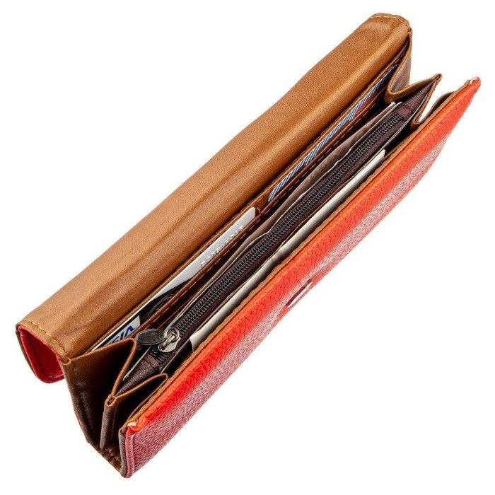 Яскраво-червоний гаманець буде до вподоби навіть вибагливій дівчині. З таким гаманцем вам буде складно залишитися непоміченим. На лицьовій стороні аксесуар прикрашає металевий логотип бренду. По краях виріб прошито рівною червоною строчкою. Аксесуар буде прекрасним і бажаним подарунком для будь-якої дівчини.