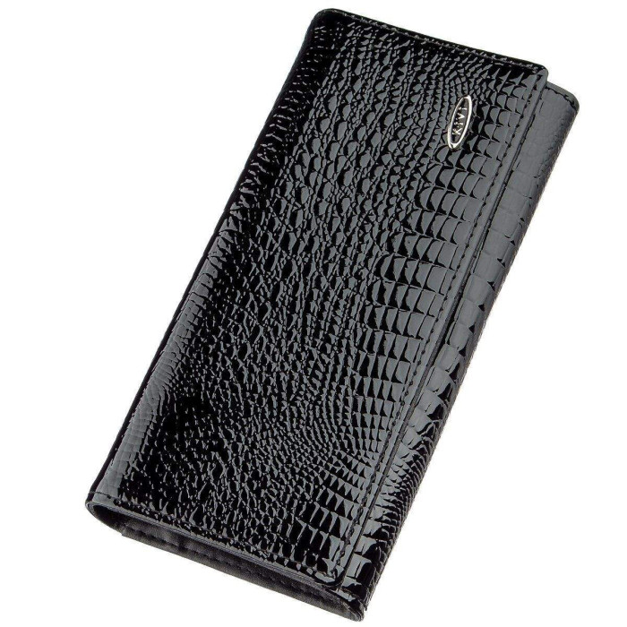 Чорний лаковий гаманець в класичному дизайні і оригінальним тиснення під екзотичну шкіру. Модель дуже практична за рахунок свого лакового покриття. Ви не побачите на виробі подряпин і потертостей. Аксесуар не вибагливий у догляді. Дизайн гаманця підкреслить ваше почуття стилю і з легкістю поміститься в вашу сумочку. Ідеальний подарунок для будь-якої дівчини.