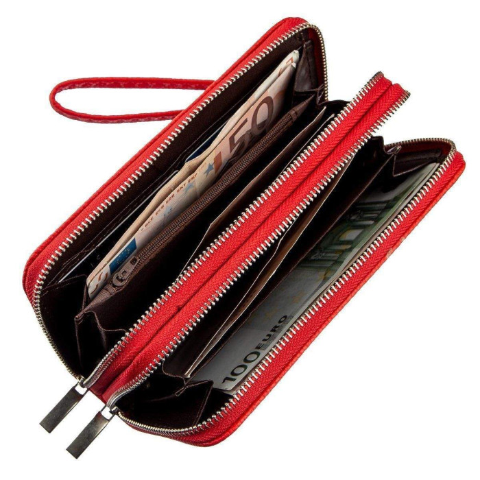 Гаманець з двома автономними і місткими відділеннями. Виріб має зручний функціонал, підібраний по всіх побажаннях дівчат. Виготовлена модель з екошкіри зернистого типу і яскраво-червоного кольору. Впевнені, що гаманець буде до душі будь-якій дівчині. Особливо модель сподобається шанувальницям яскравих відтінків і тим, хто любить досить місткі моделі гаманців. На зовнішній стороні аксесуара металевий логотип бренду. Гаманець буде прекрасним подарунком для близької людини.