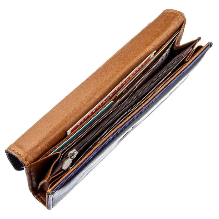 Жіночий, класичний, тонкий гаманець з гладкої екошкіри. Синій колір гаманця користується особливою популярністю у представниць жіночої статі. По краях модель прошита рівним рядком. На зовнішній стороні металевий логотип бренду. Усередині аксесуар виконаний з міцного текстилю та екошкіри коричневого кольору. Виріб буде прекрасним подарунком з будь-якого приводу.