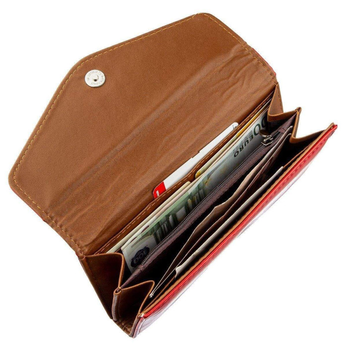 Жіночий яскравий, класичний тонкий гаманець з гладкою екошкіри. Червоний колір завжди привертав увагу дівчат. Гаманець досить компактний. Усередині модель має просторі відділення для купюр, відділення на блискавці і кілька слотів для кредиток. Виконано аксесуар всередині з екошкіри коричневого кольору і текстильної підкладки. Родзинкою моделі є металевий логотип бренду на лицьовій стороні. Гаманець дуже доступний і при цьому досить якісний. Такий гаманець буде хорошим подарунком для будь-якої дівчини.