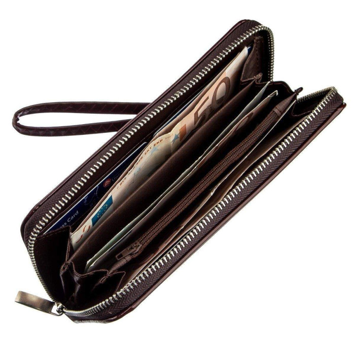 Витончений жіночий гаманець з екошкіри коричневого кольору. Аксесуар має весь найнеобхідніший функціонал: просторі відділення для купюр, слоти для карток підібрані під розмір, відділення на блискавці і відкриті кишені. Модель доповнена блискавкою сріблястого кольору і металевим логотипом бренду на лицьовій стороні. Усередині виріб виготовлений з екошкіри в поєднанні з міцним текстилем. У нашому інтернет-магазині ви можете знайти будь-яку модель за доступною ціною.