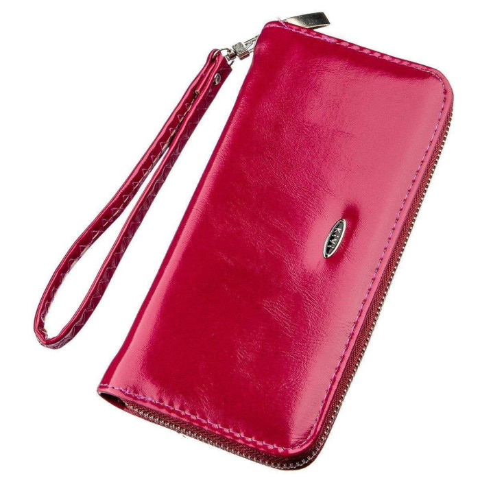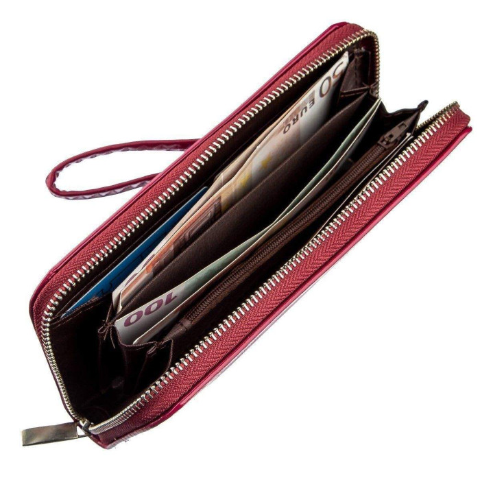 Витончений жіночий гаманець з екошкіри малинового кольору. Аксесуар має весь найнеобхідніший функціонал: просторі відділення для купюр, відділення для карток підібрані під розмір, відділення на блискавці і відкриті кишені. Модель доповнена блискавкою сріблястого кольору і металевим логотипом бренду на лицьовій стороні. Усередині виріб виготовлений з екошкіри в поєднанні з міцним текстилем. У нашому інтернет-магазині ви можете знайти будь-яку модель за доступною вартістю.
