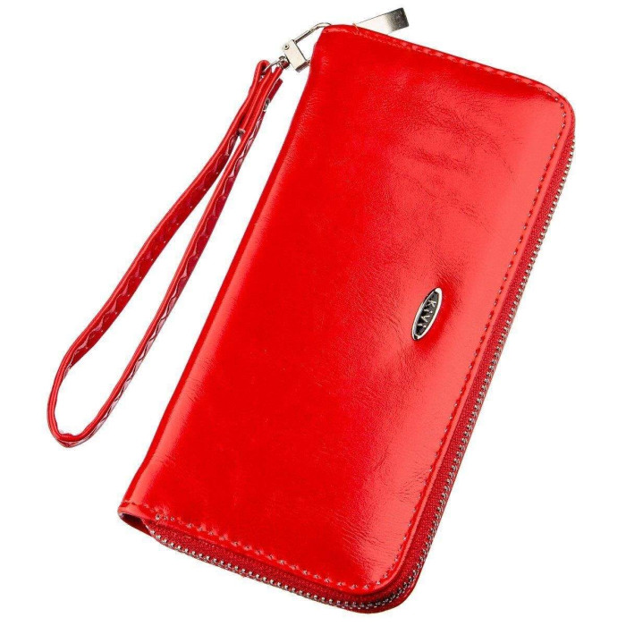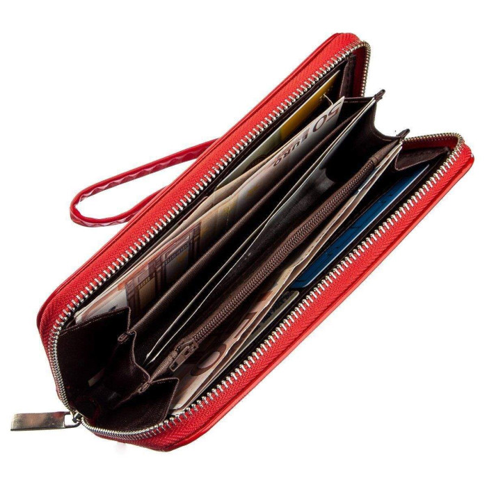 Тонкий гаманець на одну блискавку яскравого-червоного кольору. Аксесуар має просторі відділення для купюр, відділення для карток. Гаманець підійде під будь-який образ і стиль. По краях прошитий яскравою червоною строчкою в дизайн аксесуара. Такий гаманець буде прекрасним подарунком для будь-якої дівчини і підійде під будь-який образ. Усередині гаманця є ремінець-петелька і ваш гаманець перетворюється в клатч, який ви можете взяти з собою на вечірку або іншу важливу подію.