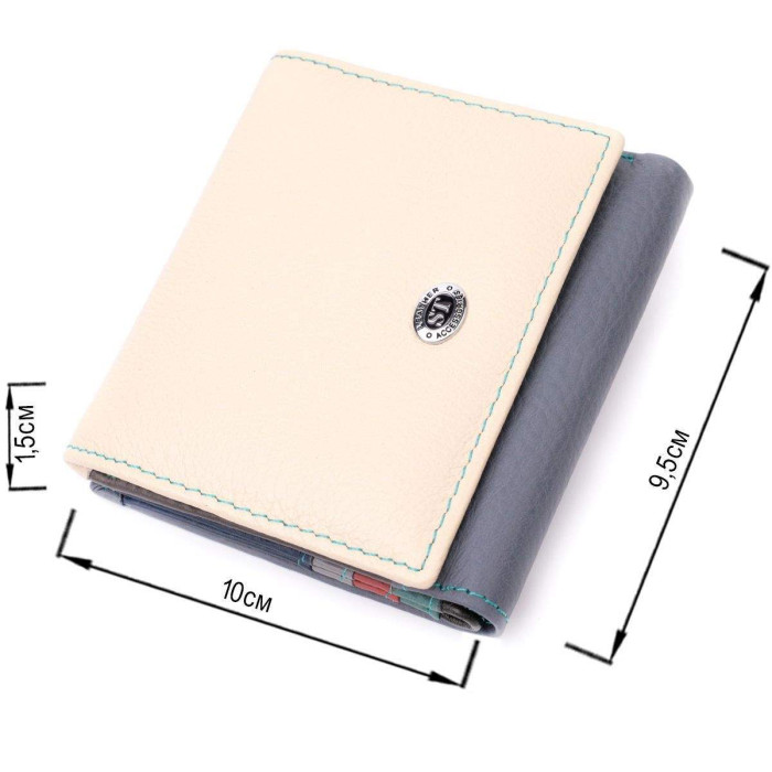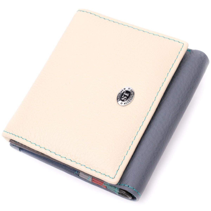 Стильне жіноче портмоне у два складення з натуральної шкіри найвищої якості. Фішкою цього гаманця є його багатобарвна гама, такий аксесуар одразу впадає у вічі, складається він з двох містких відділень для купюр, шести осередків для карт, двох прихованих кишень та кишені для монет. Зовні виріб прошитий рівним рядком бірюзового кольору по краю і прикрашений металевим логотипом компанії виробника. Портмоне доповнено надійною фурнітурою та міцною підкладкою. Укомплектований гаманець у фірмову картонну коробку білого кольору.