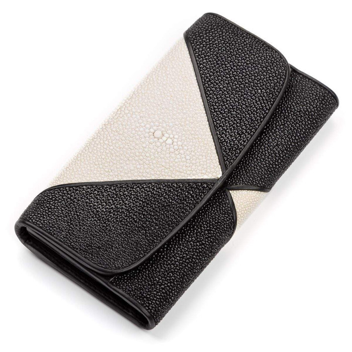 Оригінальний жіночий гаманець з натуральної шкіри морського ската, яка володіє фантастичною фактурою і красою, а також є дуже стійкою до зносу, проколів, порізів, до розривів і навіть до вогню. Весь простір шкіри покрито сотнями дрібних горбків, різного розміру, які грають на світлі, як невеликі намистинки. Аксесуар декорований, контрастними вставками з білої шкіри, що надають виробу оригінальності і яскравості. Дуже престижний аксесуар, який підійде жінці, яка цінує зручність і якість.
