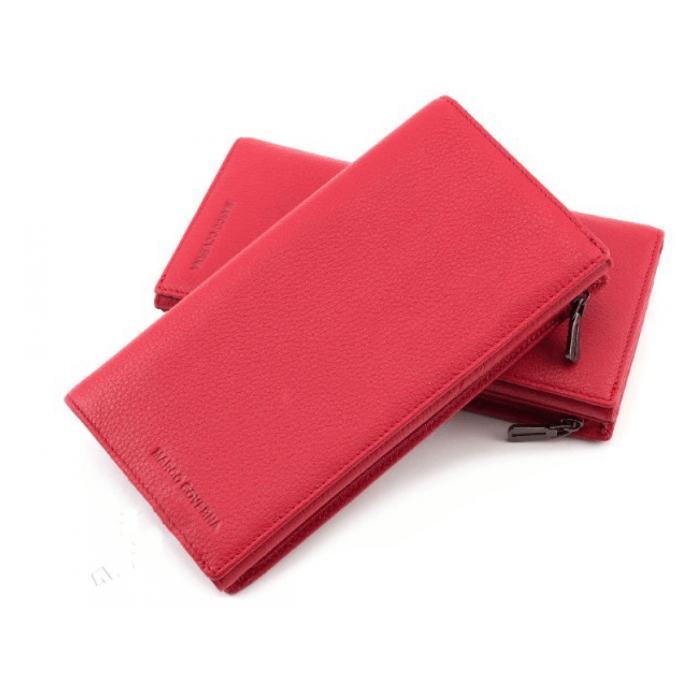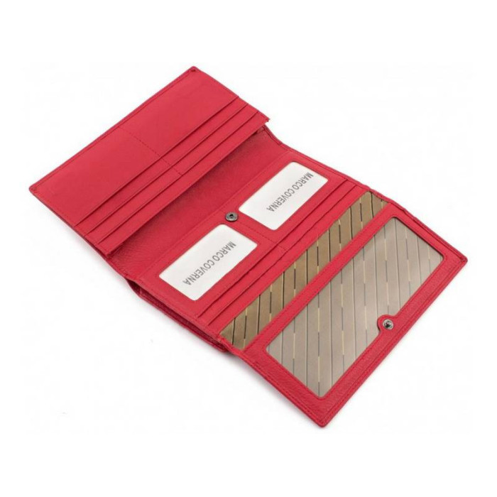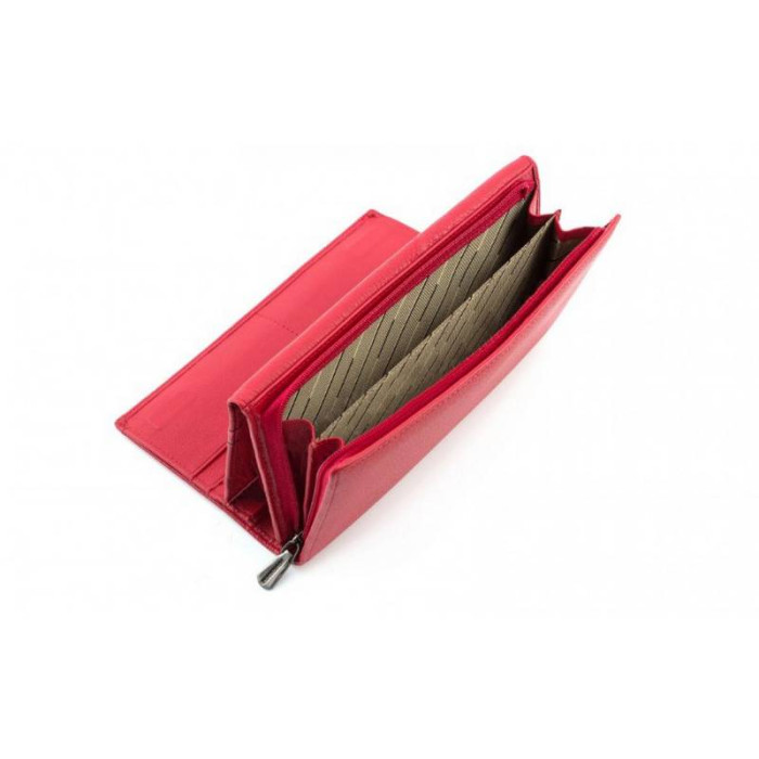 - червоний аксесуар, розмістив в собі вісім зручних поділок для візиток, три відкритих відсіки і три слоти під фото або документи;