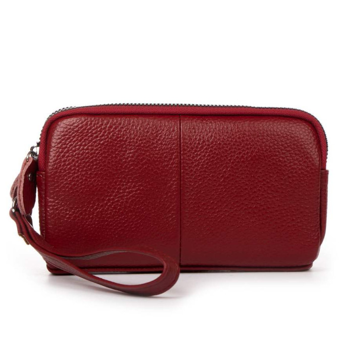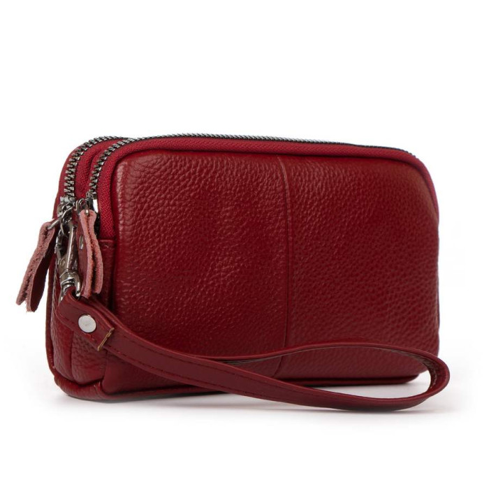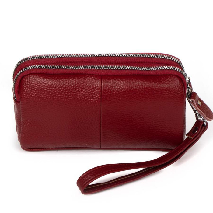 Жіноча шкіряна косметичка. Виготовлена ​​з м'якої шкіри. Два відділення, що закриваються на блискавці. Усередині є бічна кишеня на блискавці та відкрита кишеня.