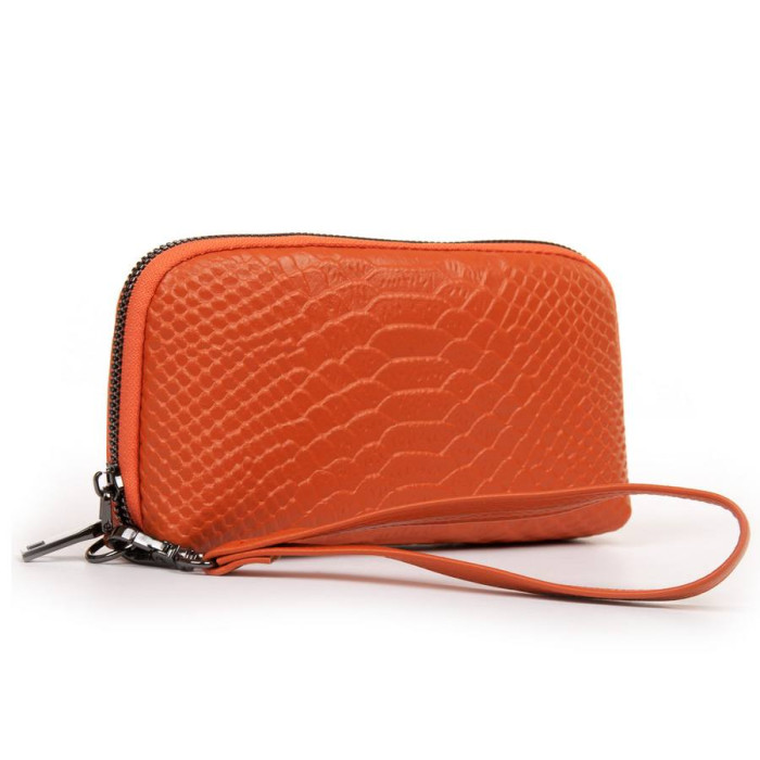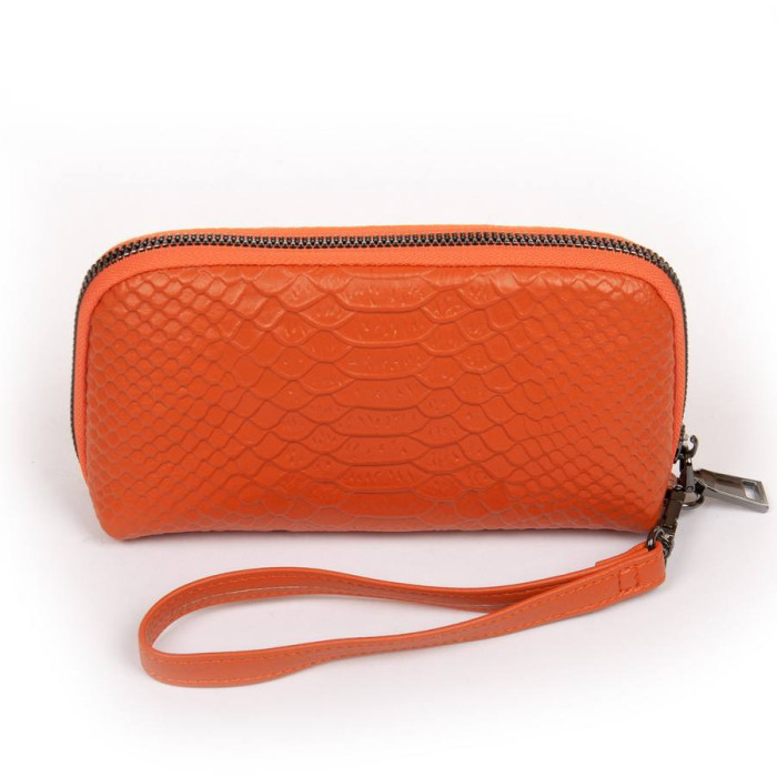 Жіноча шкіряна косметичка. Закривається на блискавку. Усередині знаходиться подвійне відділення, розділене кишенею-перегородкою на блискавці та бічна відкрита кишеня.