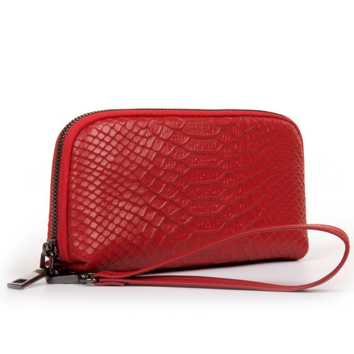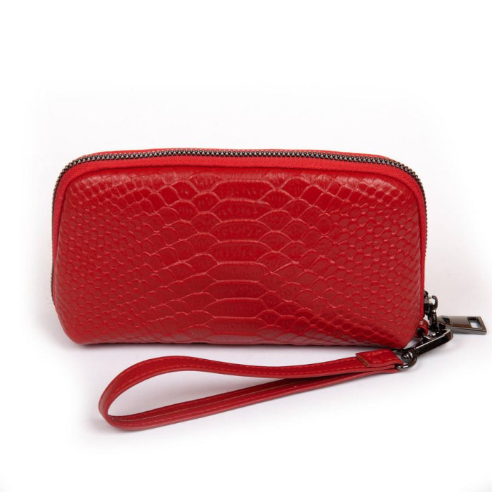 Жіноча шкіряна косметичка. Закривається на блискавку. Усередині знаходиться подвійне відділення, розділене кишенею-перегородкою на блискавці та бічна відкрита кишеня.