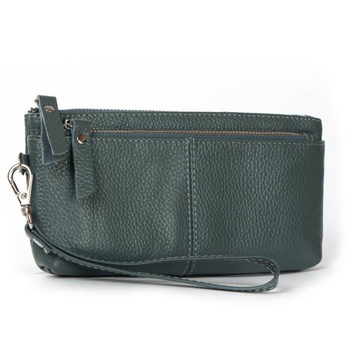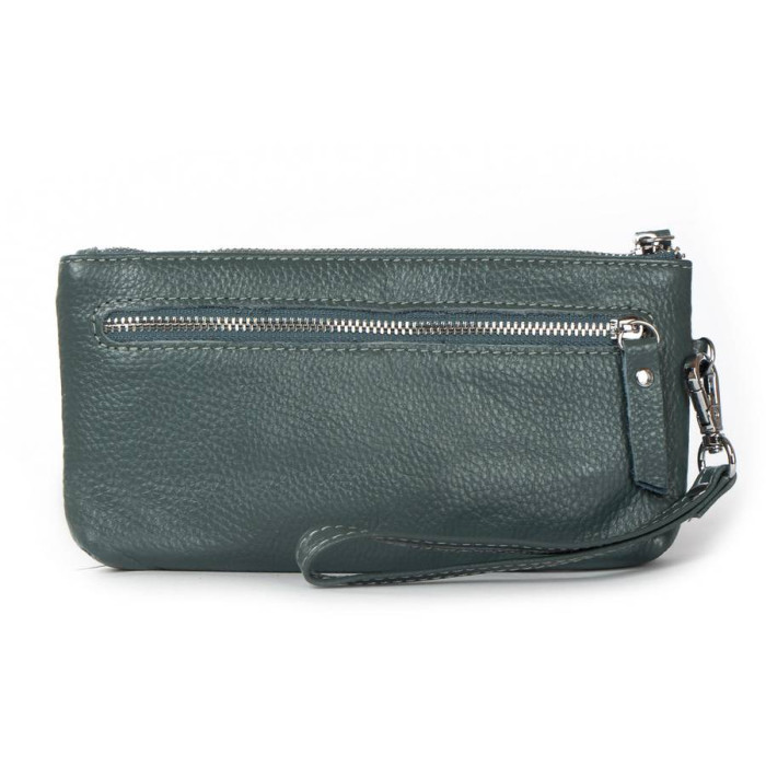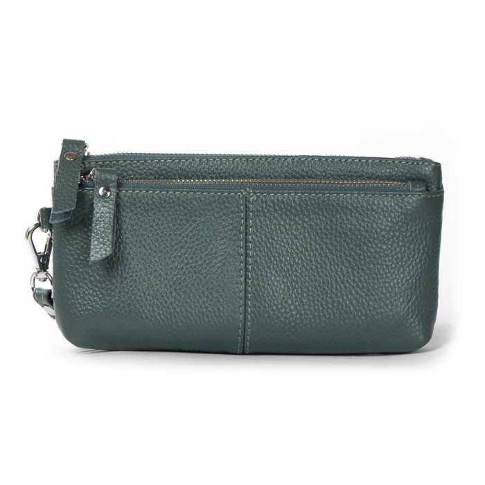 Жіночий шкіряний гаманець-косметичка. Закривається на блискавку. Одне основне відділення з боковою відкритою кишенею. На фасаді та на звороті є великі кишені на блискавці.