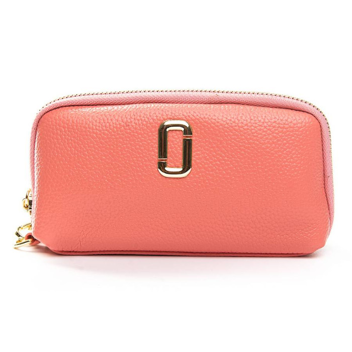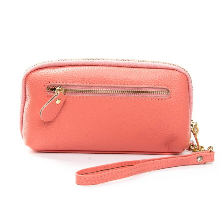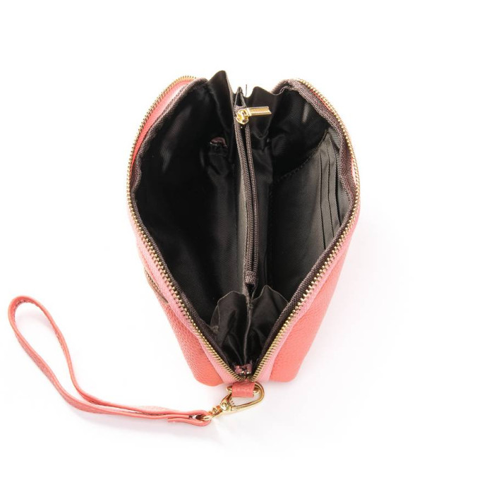 Жіночий шкіряний гаманець-косметичка. Закривається на блискавку. Всередині знаходиться подвійне відділення, розділене кишенею-перегородкою на блискавці і бокова відкрита потрійна кишеня для візитних карток. Зовні косметички на звороті є кишеня на блискавці. В комплекті знімних кистьовий ремінець. Розмір (см) 18*10*5