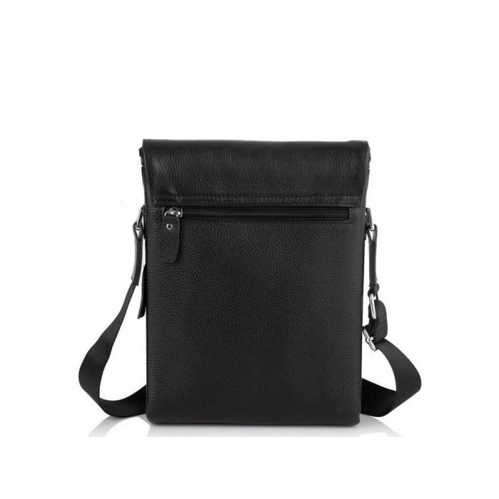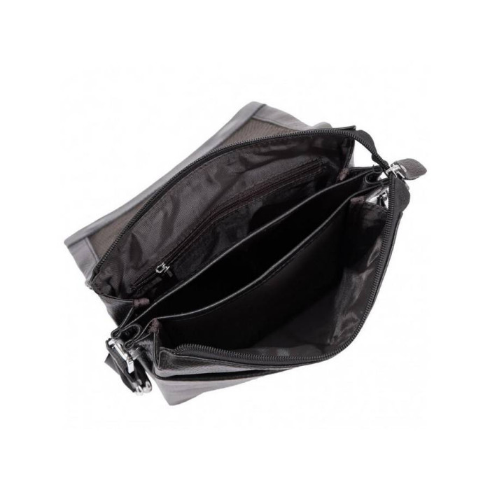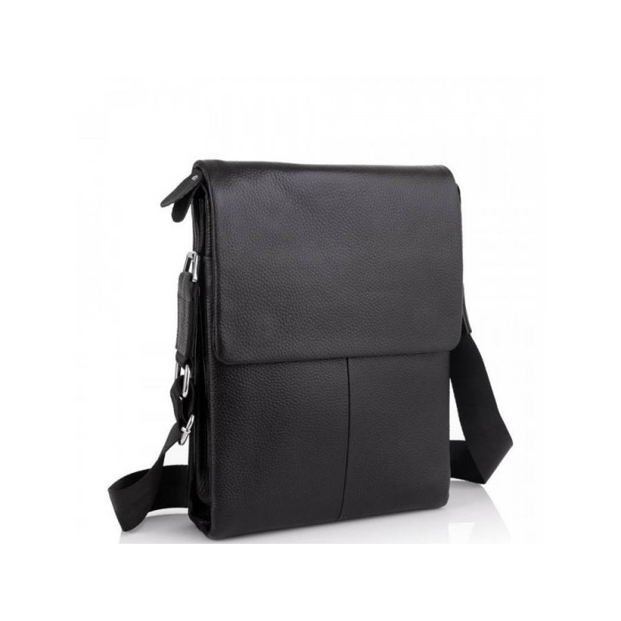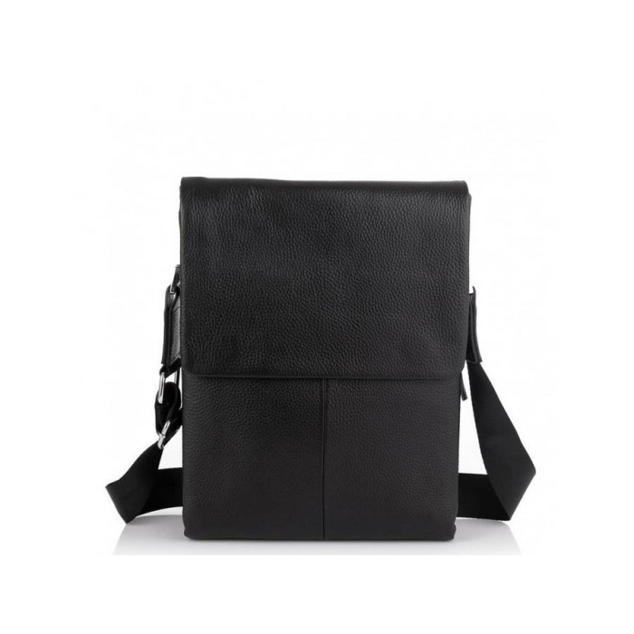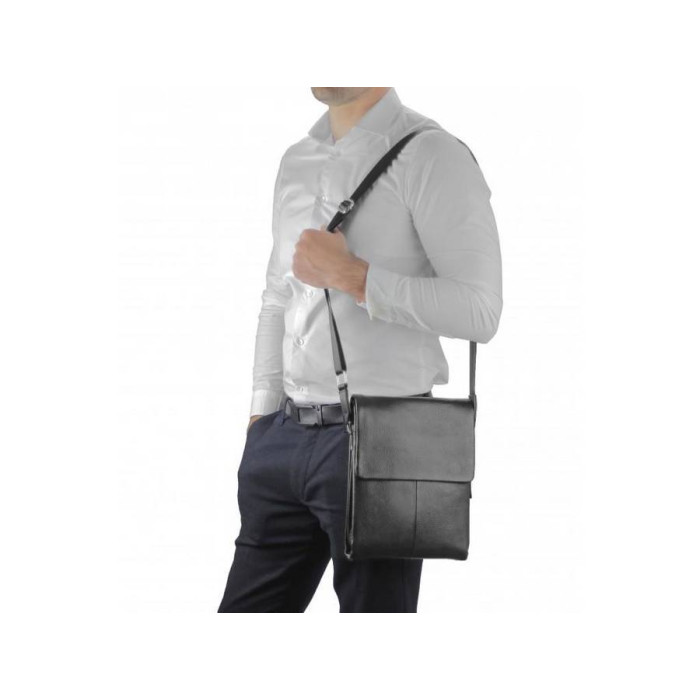 Чоловіча сумка через плече чорного кольору з зернистою текстурою. Має срібну фурнітуру і текстильний плечовий ремінь який регулюється. Усередині сумки одне основне відділення на блискавці розташоване під клапаном на магнітах. Також з лицьового боку під клапаном є кишеня відкритого типу, з тильного боку кишеню на блискавці. Усередині сумка розділена на дві частини кишенею відкритого типу, також є одна маленька кишеня на блискавці для дрібниць.