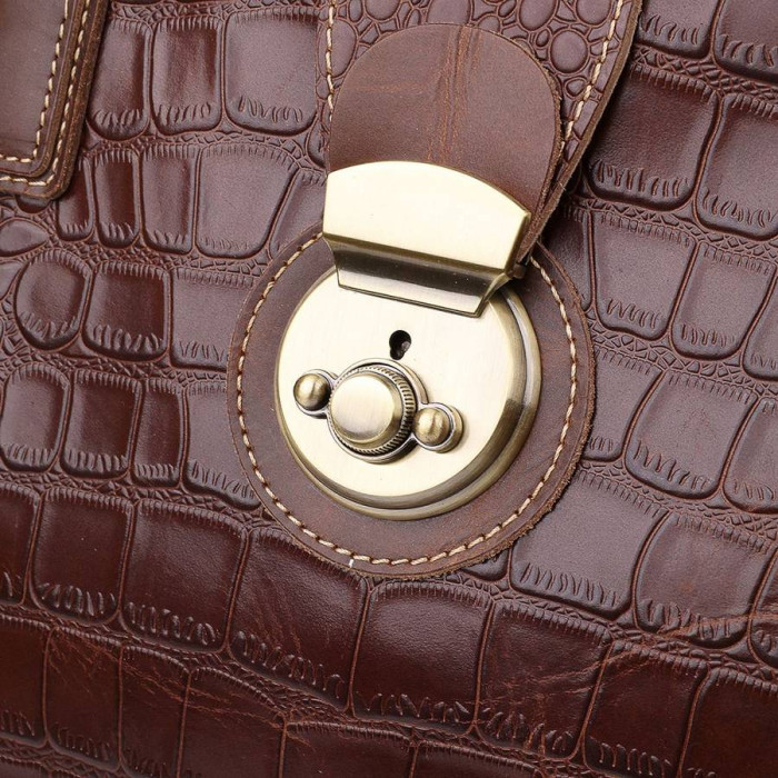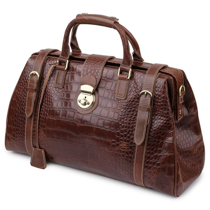 Містка дорожня сумка-саквояж в стильному коричневому кольорі з фактурою під крокодила. Має одне основне відділення з кишенями і невеликим відділенням для гаджета, яке фіксується на кнопці. На тильній стороні передбачена кишеня швидкого доступу на блискавці. Такий саквояж має шикарний презентабельний вигляд і стане незамінним супутником в будь-яких подорожах.