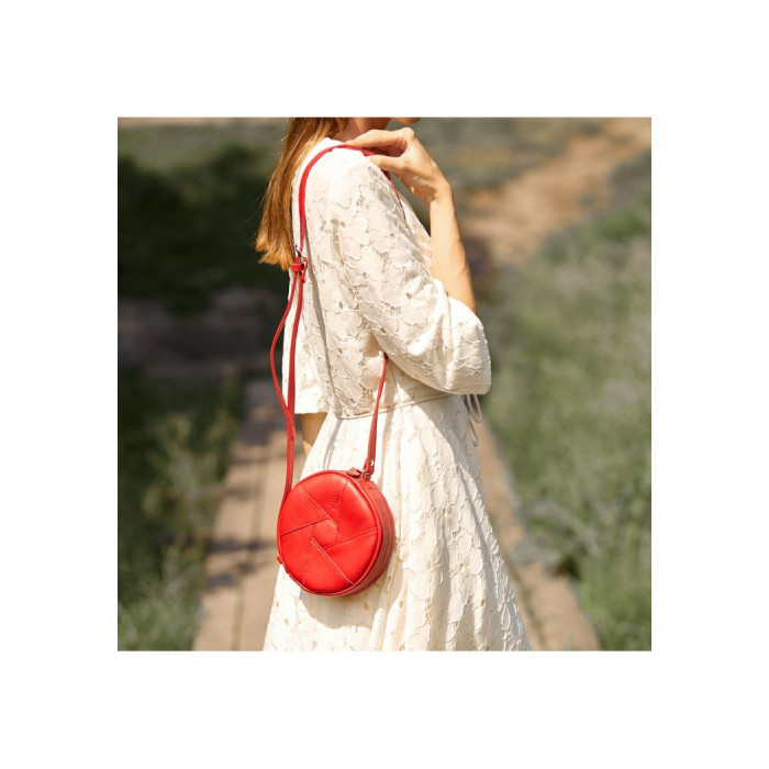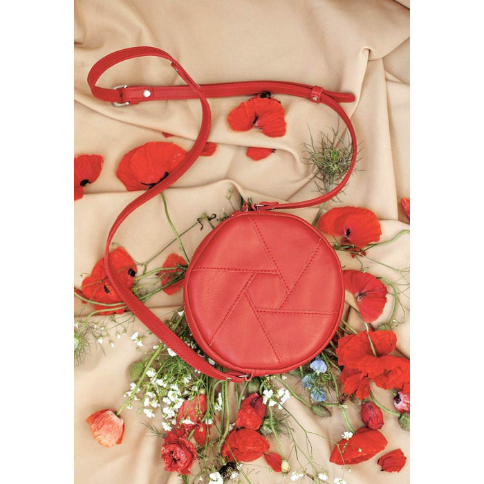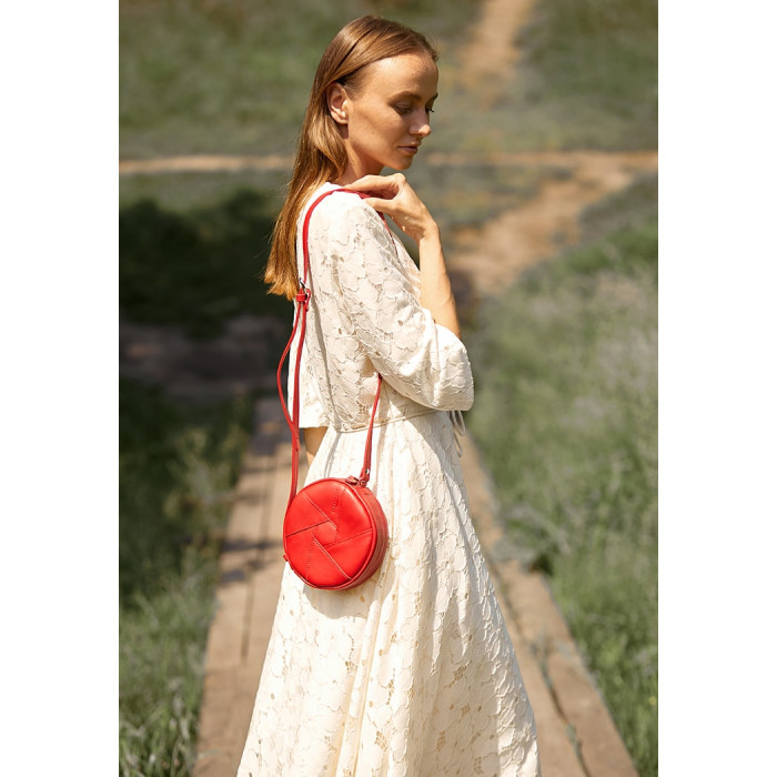 Чарівна червона сумочка круглої форми сподобається любителькам стильних і оригінальних речей.