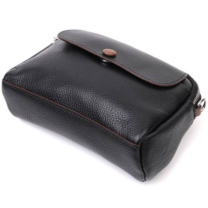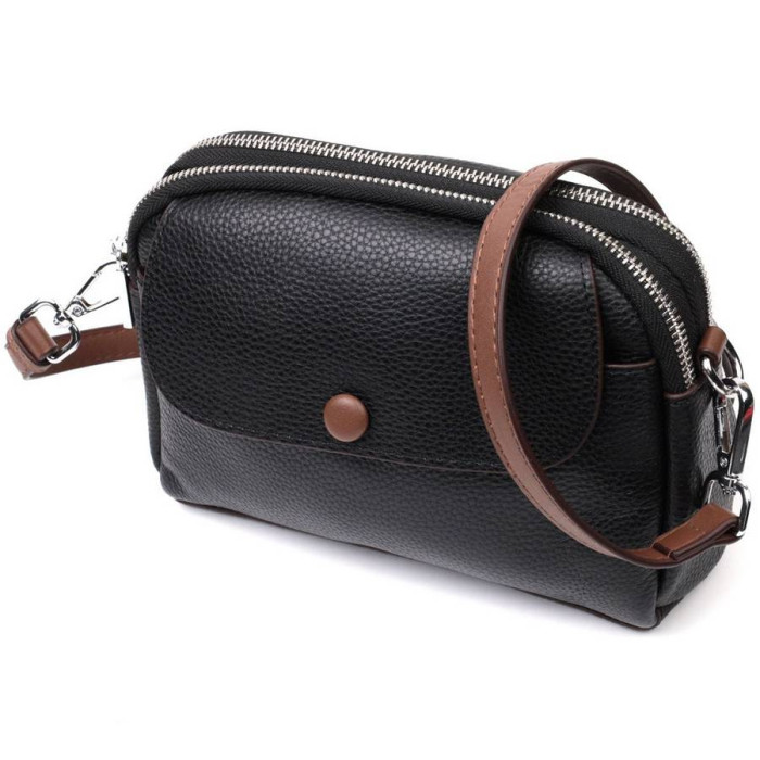 Відмінна сумка для жінок в класичному чорному кольорі, які люблять якість і комфорт. Виріб пошитий з якісної натуральної шкіри, яка довго носиться і не втрачає свого первісного вигляду. Аксесуар складається з двох основних відділень, усередині яких кишеня відкритого типу та потайна кишеня на блискавці, зовні розташована кишеня на блискавці з тильного боку та кишеня, що закривається клапаном на магніт, на лицьовій стороні. Носити сумку можна в руці, на плечі і через плече, для цього є шкіряний ремінь, що знімається. У виробі використано якісну фурнітуру срібного кольору. Універсальний варіант сумки як на вечір так і як сумочка на кожен день.