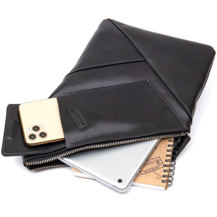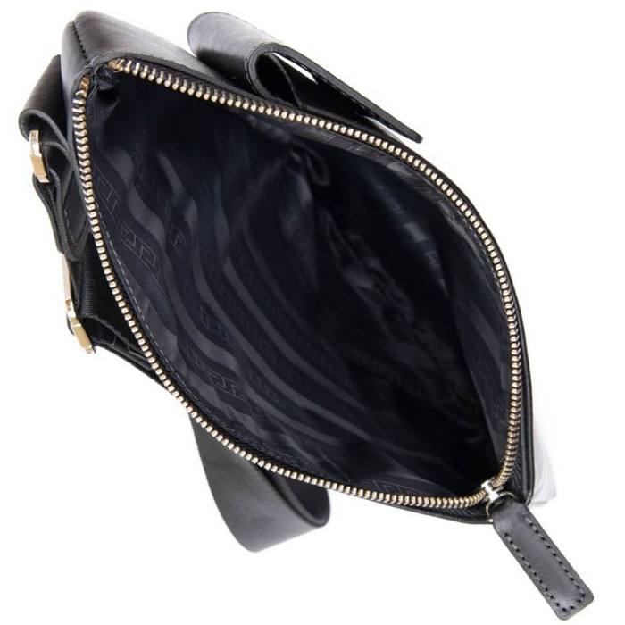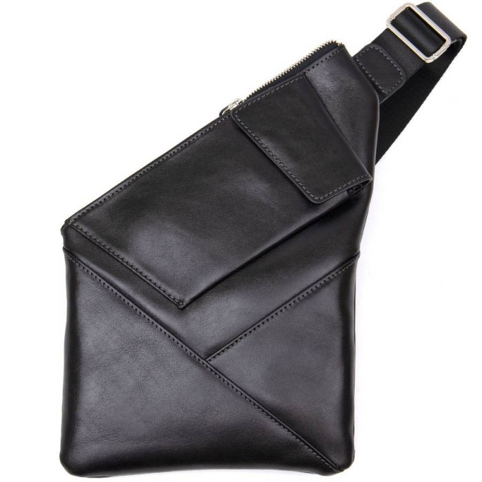 Цікава чоловіча сумка через плече нестандартної форми, яка дуже модна на сьогоднішній день. Виконана з міцної і зносостійкої натуральної шкіри. Колір чорний, фактура гладка і глянсова. Ремінь з міцного текстилю, його можна регулювати по довжині. Упакована дана сумка в красивий фірмовий чохол з ручками.