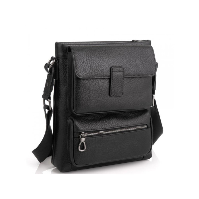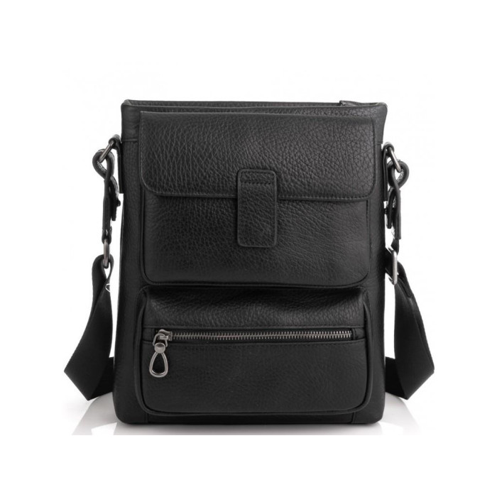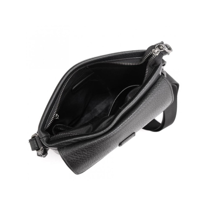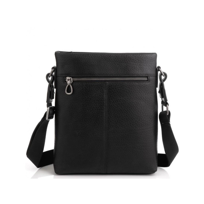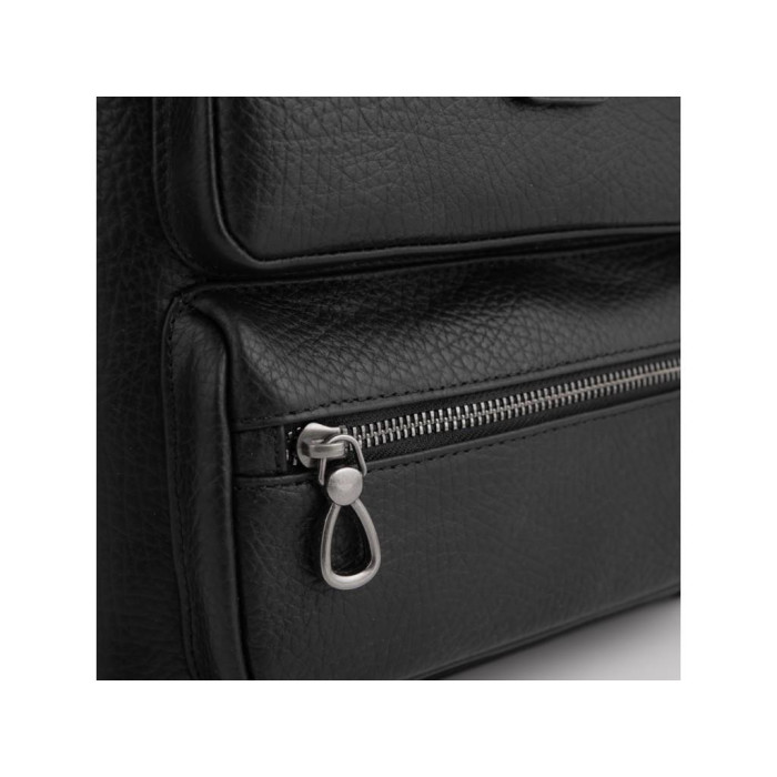 Шкіра має грубозернисту структуру. Шкіряна сумка оснащена знімним текстильним ременем, який регулюється по довжині. Пуллери в сумці - металеві, фурнітура - темно-срібна, підкладка щільна, чорна. Шкіряна сумка складається з основного відділення, всередині якого є дві кишені відкритого типу і одна кишеня на блискавці для дрібниць. З лицьового боку накладна кишеня на магнітній кнопці, а також накладна кишеня на блискавці. З тильного боку- кишеня на блискавці горизонтального типу.