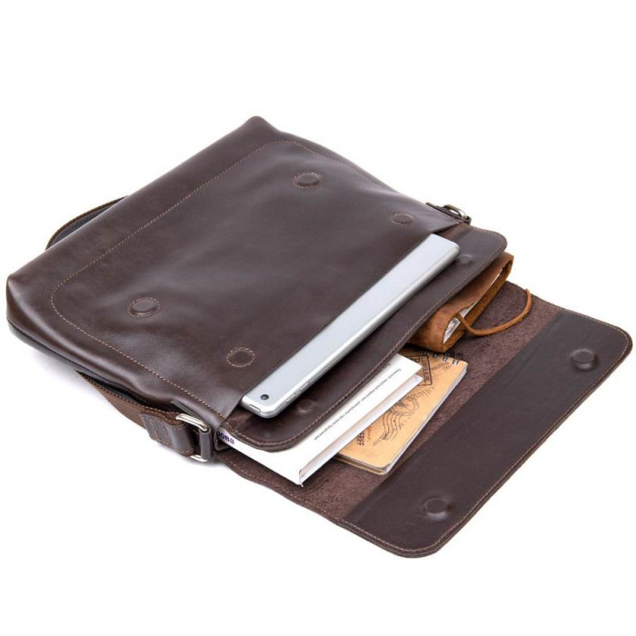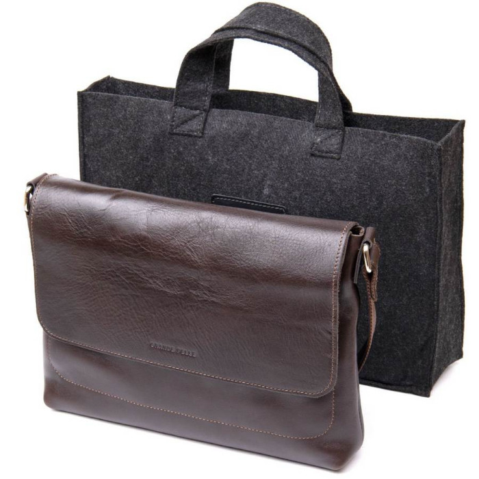 Прямокутна чоловіча сумка для чоловіків будь-якого віку. Виготовлена з зносостійкої натуральної шкіри. Колір виробу - коричневий з шоколадним відтінком. Має красиву і гладку фактуру. Усередині помістяться документи, планшет, папери формату А4 та інше. Ремінь зроблений в комбінації шкіри та текстилю, що, безсумнівно, продовжить термін його експлуатації.