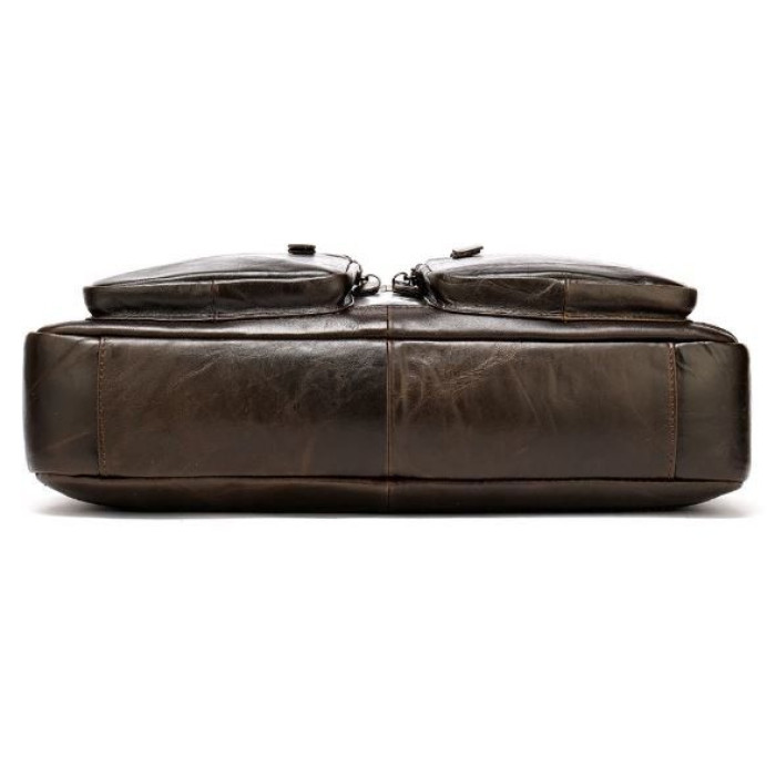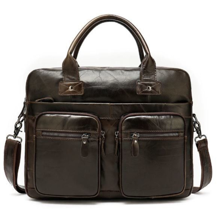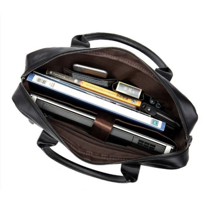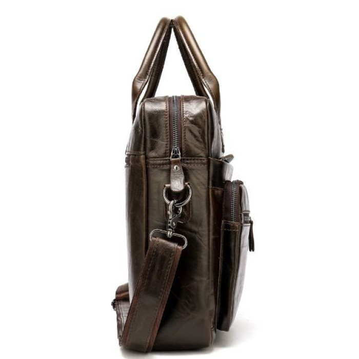 Зручна сумка для ноутбуку. Сумка оснащена всім необхідним функціоналом для найнеобхіднішого. Модель можна носити як в руках, так і на плечі. Аксесуар має текстильний ремінець, що знімається, зі шкіряною вставкою і шкіряні ручки для зручного носіння в руках. Сумка по краях акуратно прошита рівним коричневим рядком. Доповнена якісною фурнітурою сріблястого кольору в дизайн аксесуару. Сумка має високу стійкість до зносу і довго носиться. Вибираючи шкіряну сумку, ви купуєте якісну річ не на один рік. Сумка доповнена шкіряними ручками для носіння в руках. У нашому магазині ви можете знайти величезний вибір якісних аксесуарів за доступними цінами.