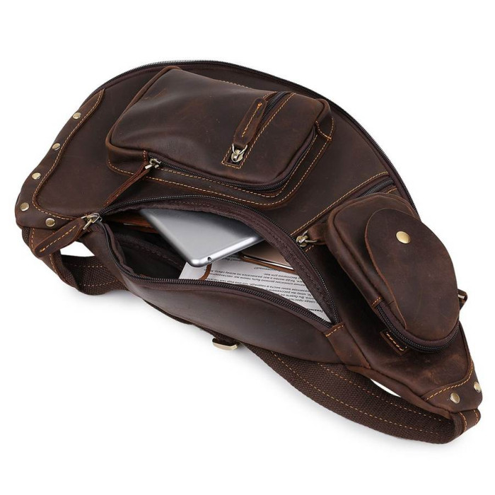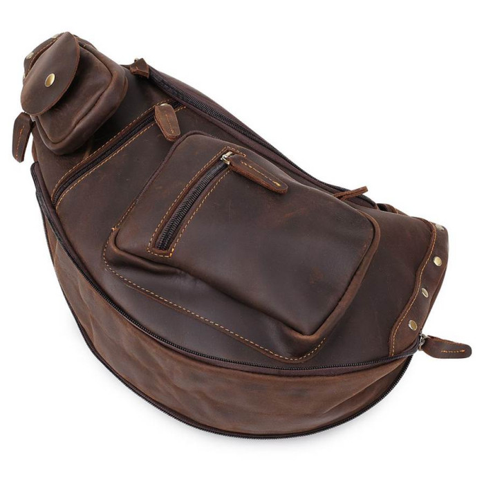 Чоловіча сумка через плече в мега популярному дизайні і в красивому насиченому коричневому кольорі. Виконана з натуральної висококласної шкіри з вінтажною фактурою. Усередині одне просторе відділення, зовні є 4 кишені на блискавці і одна сумка-кишеня, яку можна зняти і прикріпити собі на пояс, що дуже зручно і практично. Для зручності також передбачений розширювач обсягу на блискавці. Це відмінна сумка на подарунок дорогій людині.
