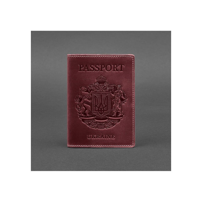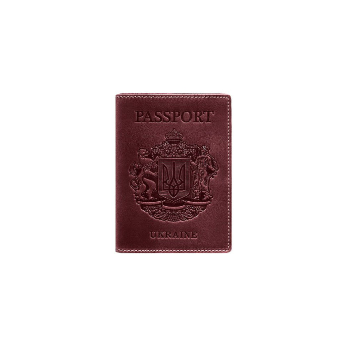 Наша нова обкладинка виготовлена зі шкіри crazy horse, з вінтажною матовою поверхнею в кольорі виноград. Передня частина аксесуара прикрашена тисненням у вигляді українського герба і написом Ukraine