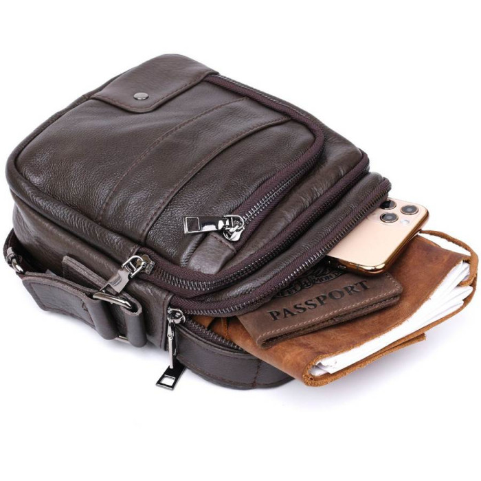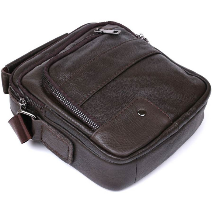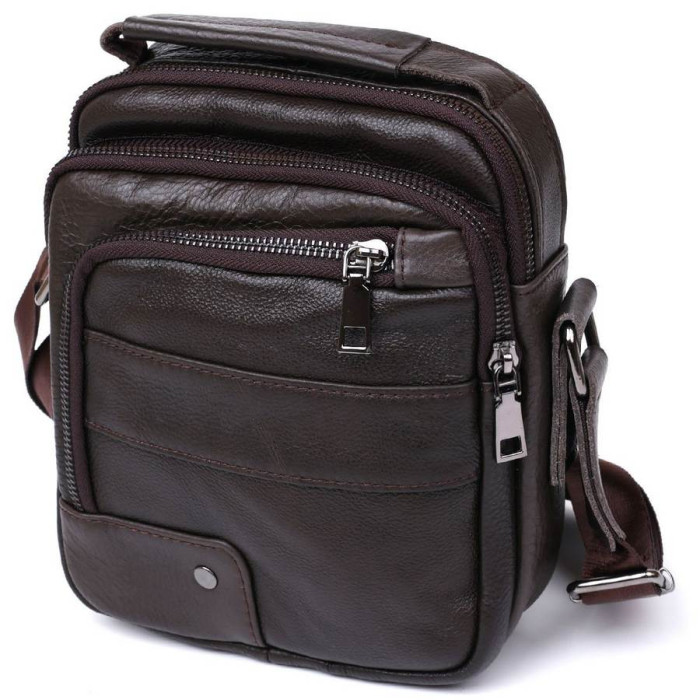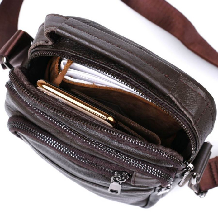 Практична чоловіча сумка із натуральної шкіри високої якості виконання. Має стриманий та стильний дизайн. Колір виробу – коричневий, що виглядає дуже красиво та сучасно. У цій моделі передбачено містке основне відділення та просторі зовнішні кишені на блискавці.