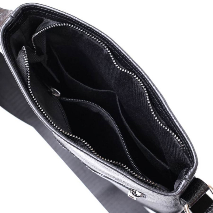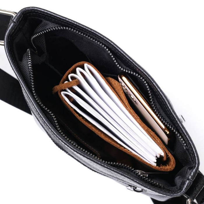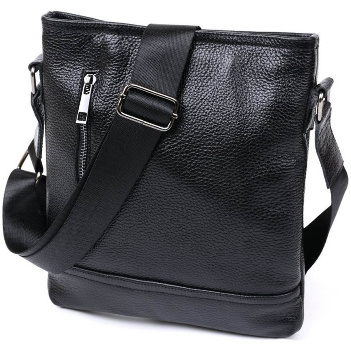 Стильна сумка для чоловіків в універсальному чорному кольорі із зернистою фактурою. Матеріал виготовлення – натуральна шкіра високої якості та високою стійкістю до зношування. Має містке відділення на блискавці та дві зовнішні кишені. Така сумка прикрасить гардероб будь-якого чоловіка.